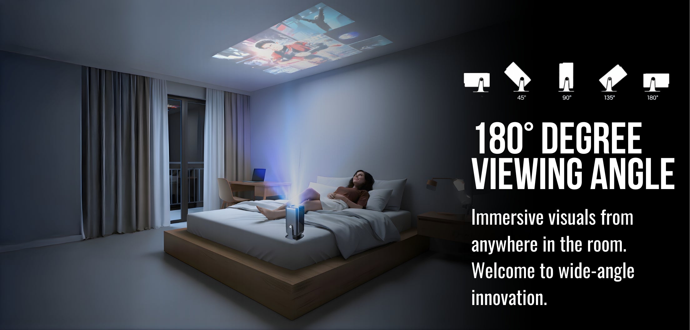 - 180° Freestyle Rotation: Project from any angle with the innovative freestyle rotation feature, allowing you to easily cast images onto walls, ceilings, or any surface.