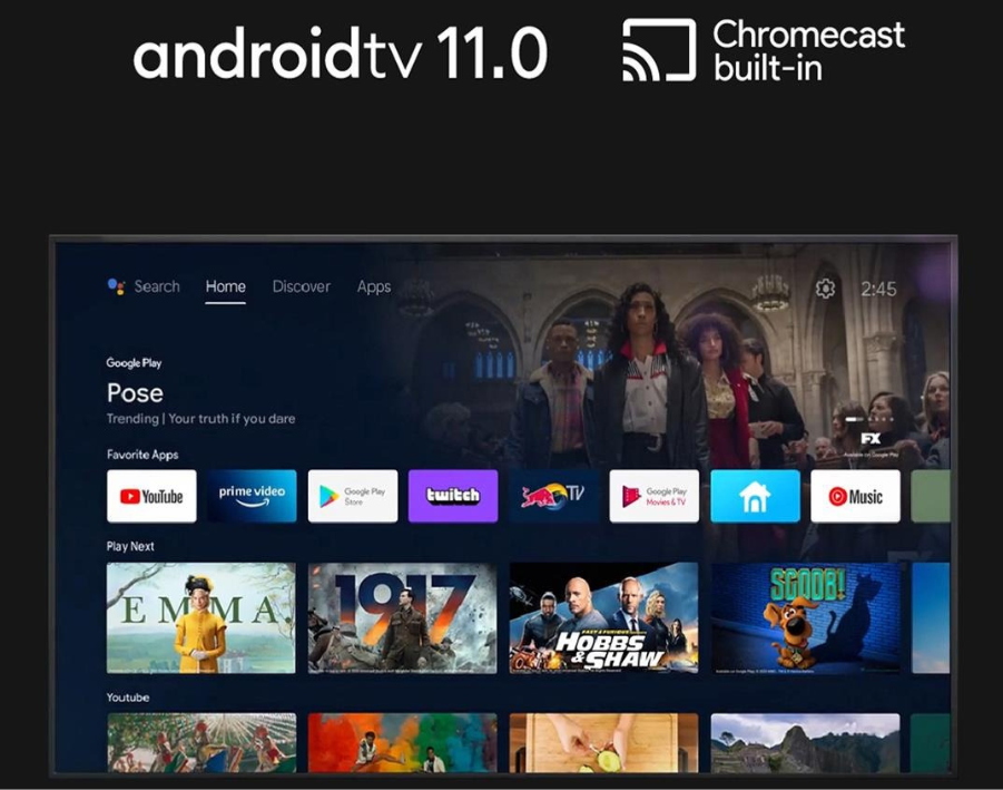 Android TV 11.0: Access to a wide range of streaming apps, games, and content through the Google Play Store.