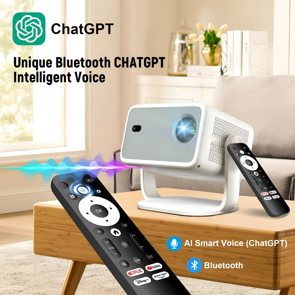 You can control your projector with voice commands like "Open Netflix" or "Search YouTube" using the included Bluetooth remote with ChatGPT AI.