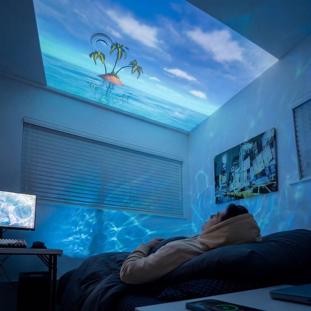 Projected straight onto your ceiling. Set up the Neo Cloud on your nightstand and watch anything on the ceiling above you.